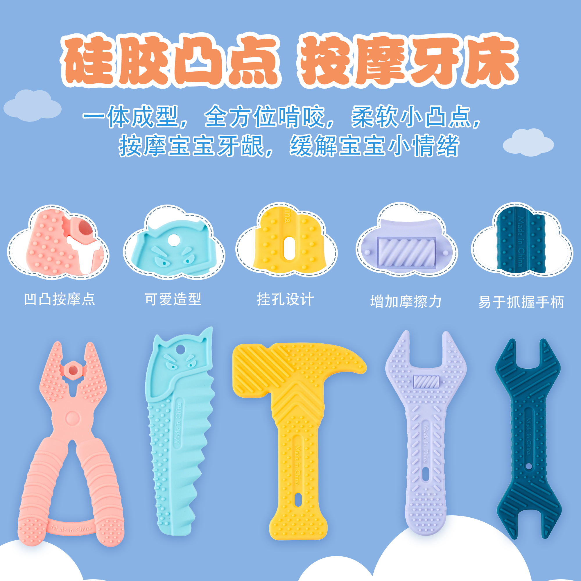 亞馬遜錘子扳手牙膠嬰兒硅膠磨牙棒寶寶卡通兒童防咬手牙膠5件套