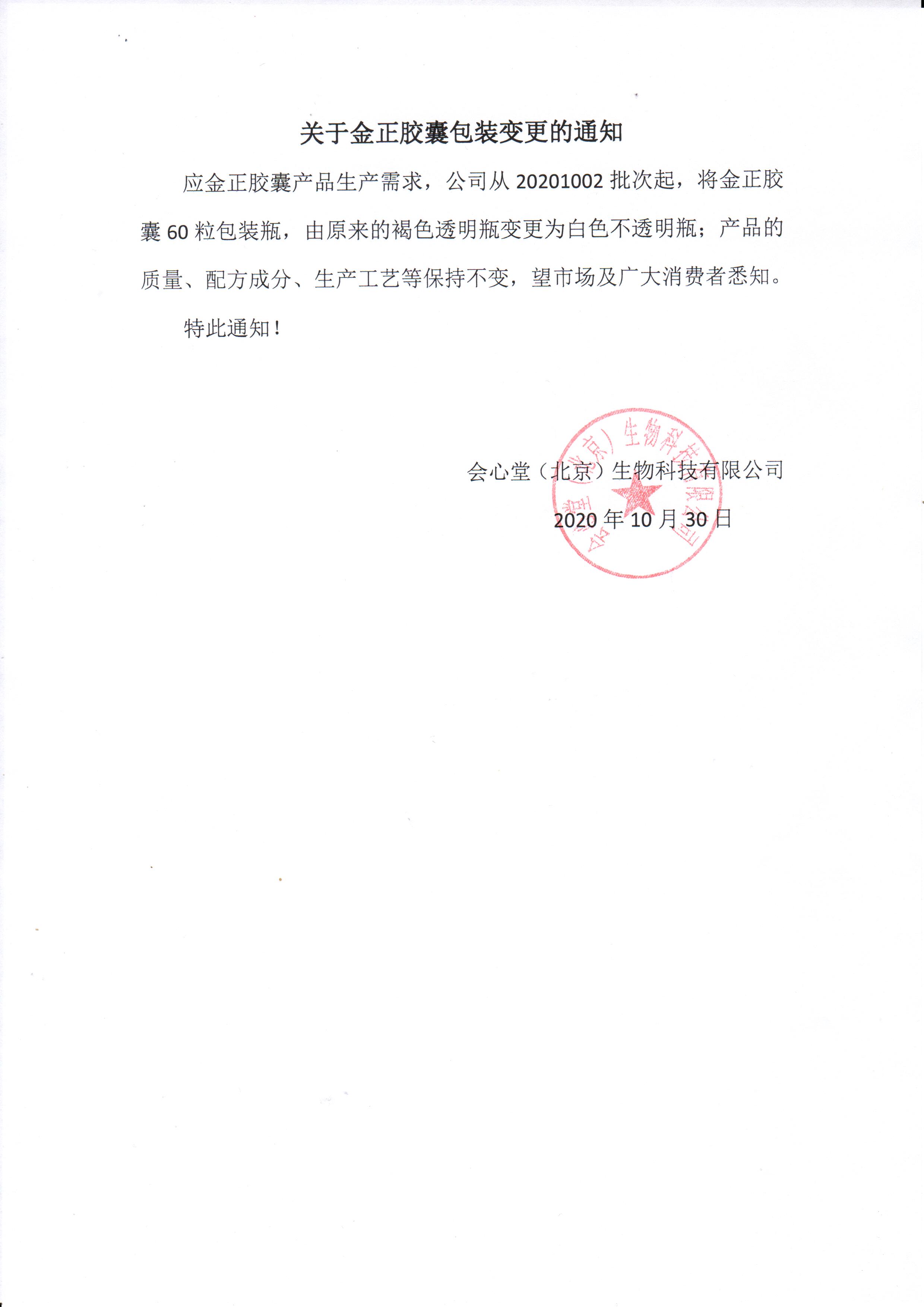 關(guān)于金正膠囊包裝變更的通知